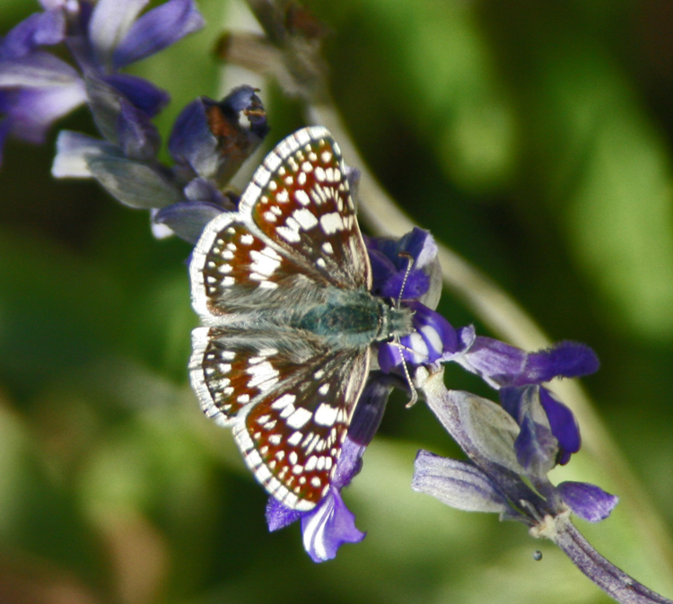 The Desert Checkered Skipper pictured below was attracted to the mealy sage in the beds on the west side of the house. I love the dark teal color of his body.
