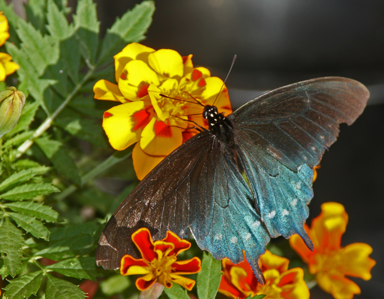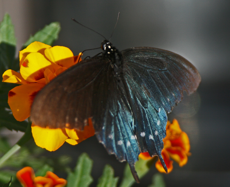 This Pipevine Swallowtail seemed to prefer the French Brocade marigolds. It was difficult to get a really good picture of him in the late afternoon light, but his iridescent dorsal side showed up pretty nicely.