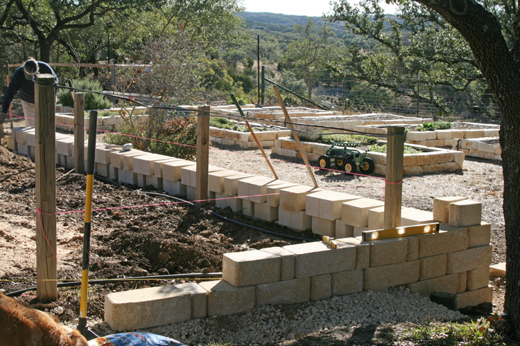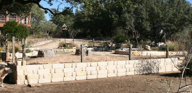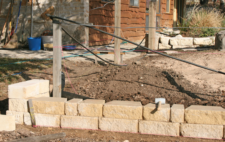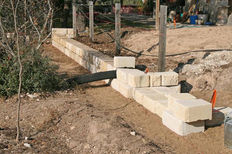 Despite the holiday festivities and numerous football games, Ron has made excellent progress with the retaining wall. It took several days to get the site prepped and the first course of stones installed and leveled, but the pace of things has really picked up now. I took photos from several different angles to hopefully give you a sense of how the wall is going to fit in the space. As can be seen in some of the pictures, Ron is installing a french drain at the base of the wall to improve and direct drainage, which is a really good idea since we will be planting a Japanese maple at the top of the wall tucked under the oak tree.