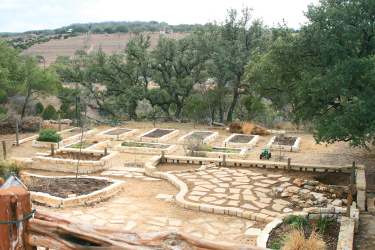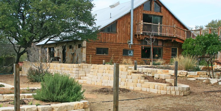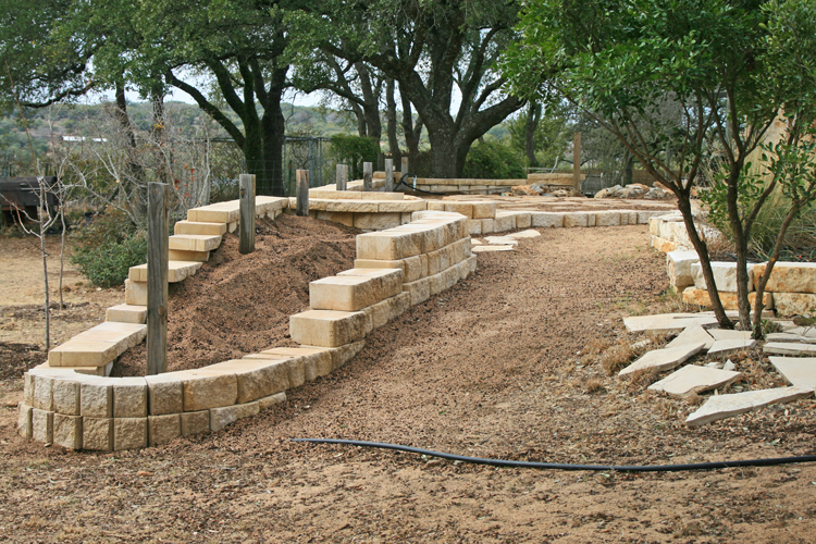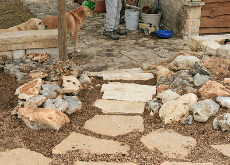 From above you can see how the whole area lays out. I am pleased with the basic design and materials. It looks pretty stark right now, but once we get the water feature, trellis, and plant material installed it will look wonderful. I already mentioned the Japanese maple that will flank the water feature. I also plan to install a Mexican buckeye tree on one side of the retaining wall stairs, and a Prairie crab apple tree on the other side. The grotto area will feature ferns and shade loving plants, and the sunny areas will feature native perennials and grasses.