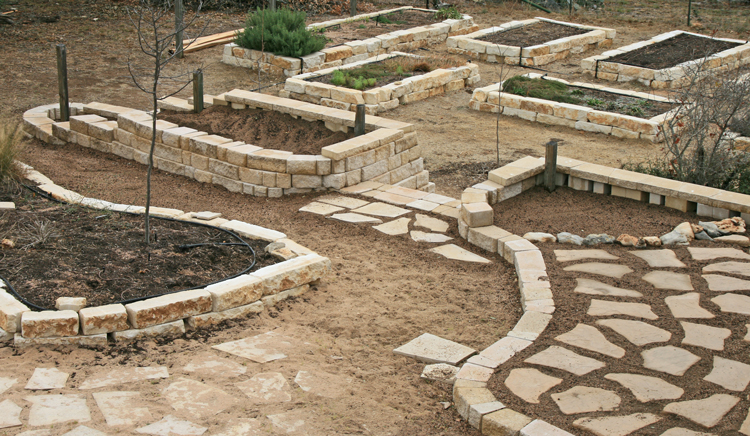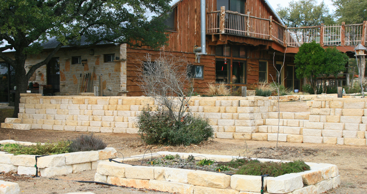 The retaining wall is pretty much complete and looks great. We will be building a raised bed running along the entire base of the wall to either side of the staircase using the same sawn limestone that we used to build the raised garden beds. Above the retaining wall we will be constructing a single post design trellis structure using the existing fence posts as the foundation for that structure. We decided on rough cedar for the trellis material.