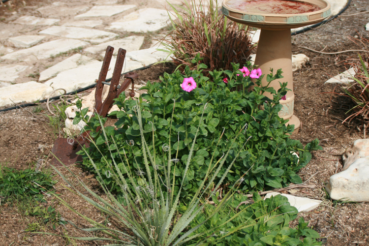 These pink Laura Bush petunias are lovely. They are more on the pink side than the more common purple variety, and their foliage is bigger and a much deeper green as well. I sowed these seeds almost a year ago, and they did not germinate until December. What a pleasant surprise it was when they finally came up. They should now reseed themselves every year.