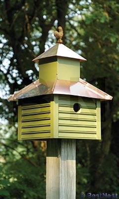 We left the posts to either side of the stairs taller than the rest, and we bought a pair of matching bird houses to mount on each of them. I love these bird houses which I found on BestNest.com. It was really hard to make a decision on which one to get because their selection was huge. I settled on these rooster bird houses since they fit with our rustic country feel, and I think their size, they are roughly a foot square and 19″ tall, should be about right for the space.