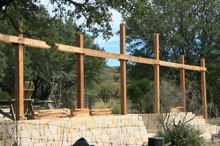 Trellis construction has been slow, but steady. With every additional element the structure looks better and better. The header boards are completed, the posts have been cut to length, and it looks like the structure balances well with the size and scale of the retaining wall below.