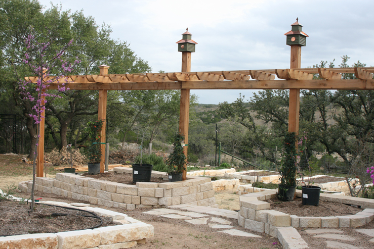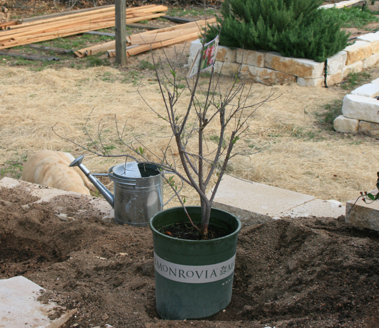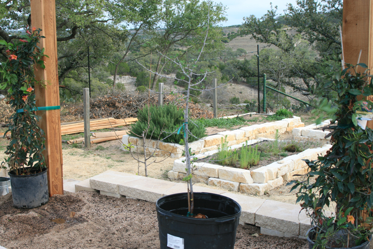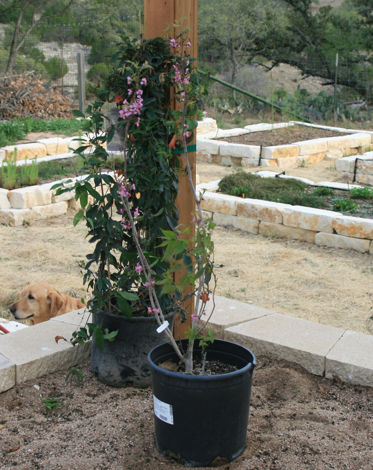 I sent Ron to the Natural Gardener and Barton Springs Nursery today to search for the trees and vines that I selected to plant in the upper trellis beds. Much to my delight, he was able to find everything I wanted. We didn’t have time to plant them this evening, but we placed them in the locations where they will be to get an idea of how they will look, and I am pleased with the effect already.