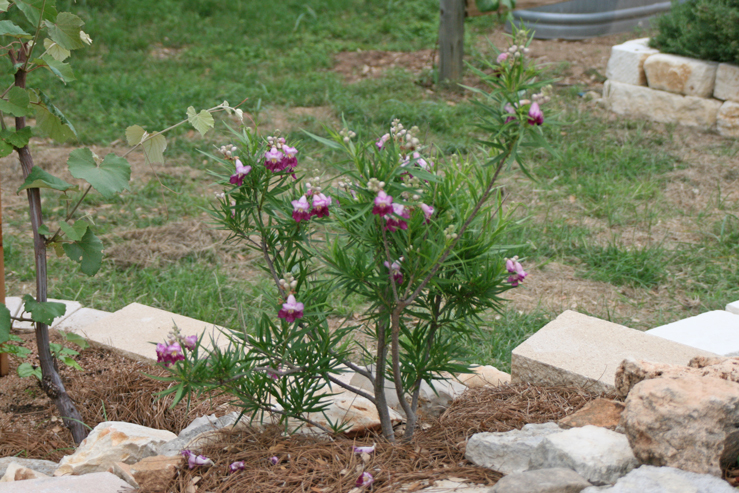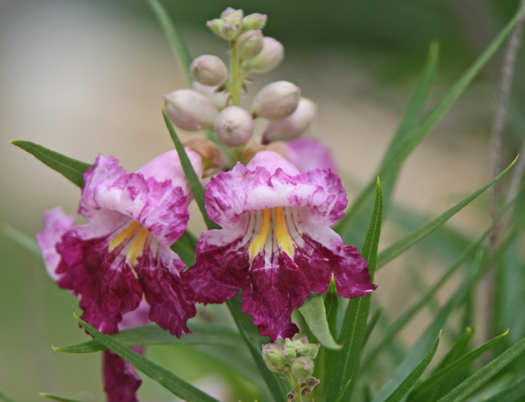 I like the combination of the dark purple of the desert willow blooms with the tangerine color of the crossvine on the trellis adjacent to it (but not visible in this shot).