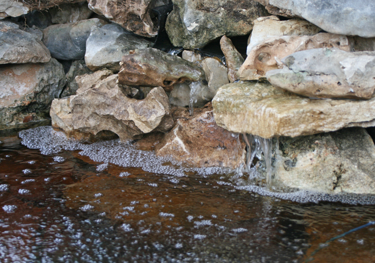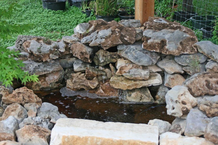 I didn’t want the waterfall to be too loud. I just wanted a gentle murmur, so we kept the elevation of the falls close to the pond, and placed rocks in the flow to break it up.