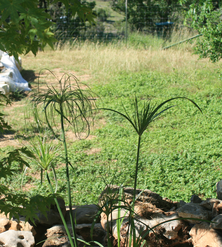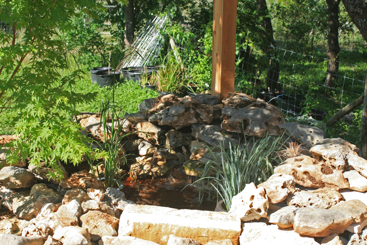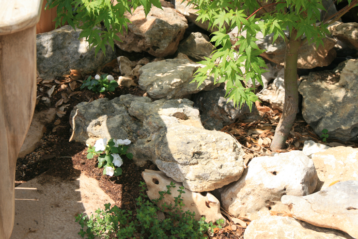 The grotto pond area is taking shape nicely with the addition of plants in and around the pond. We put a Mexican papyrus, a blue-green sedge, and a ribbon grass into pots and placed them on rock shelves in the pond. I also scattered ivy, creeping thyme, potato vine, and white impatiens into the rocks surrounding the pond. And I placed some potted plants around the perimeter of the grotto to soften the edges and to add more green to the area.