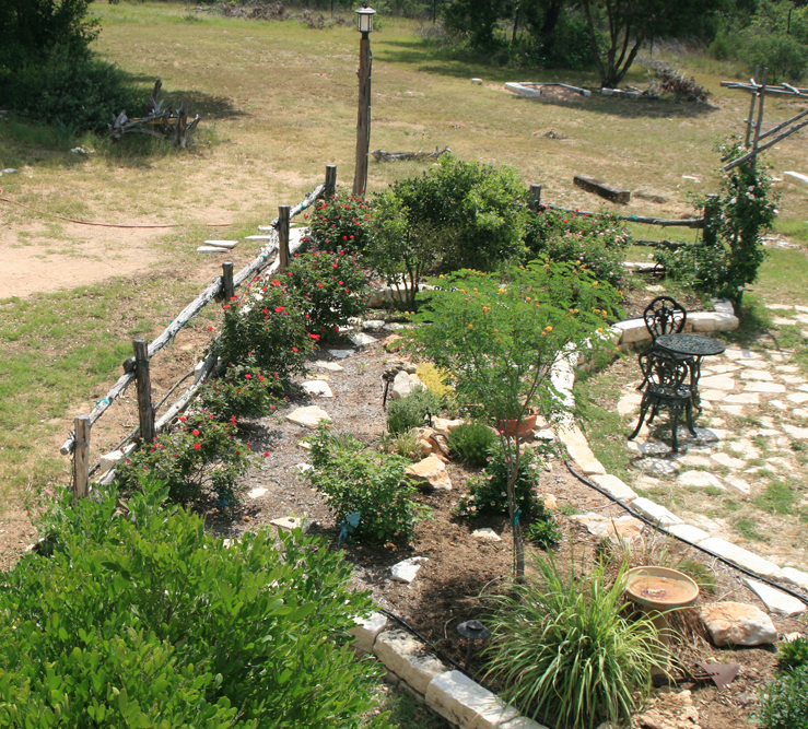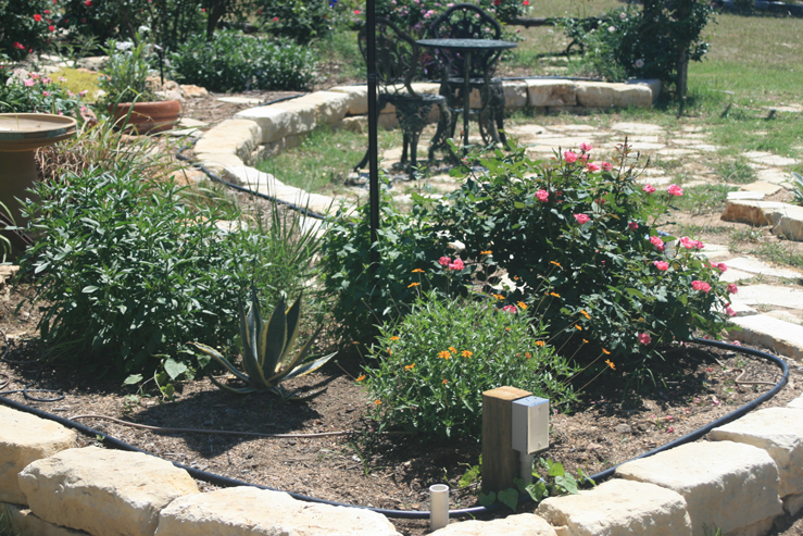 The courtyard is transitioning from its spring look into its summer appearance. The knock out roses continue to push out new foliage and canes along with a continuous show of blooms. The caldwell pink and fairy roses now have their first wave of blooms, and the new dawn and Belinda’s dream are blooming as well. I transplanted a Zexmenia that had been growing where the retaining wall was built into the north courtyard bed next to a pink knock out rose, and it is looking very happy with its new home. The echinacea are sending up blooms, and I planted some yellow and dark purple petunias, and a yellow osteospermum for added color. Clearly spring is almost over here, and summer will be in full swing soon.
